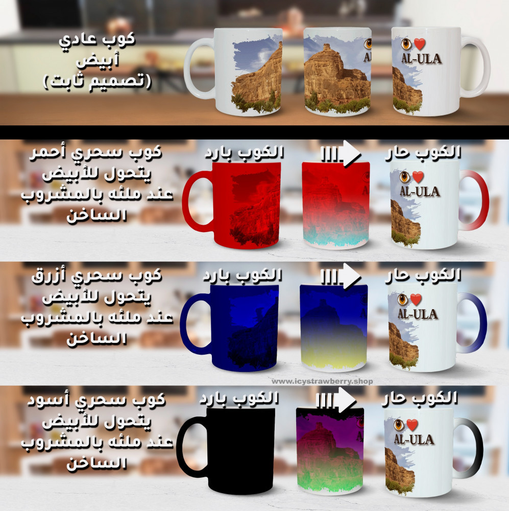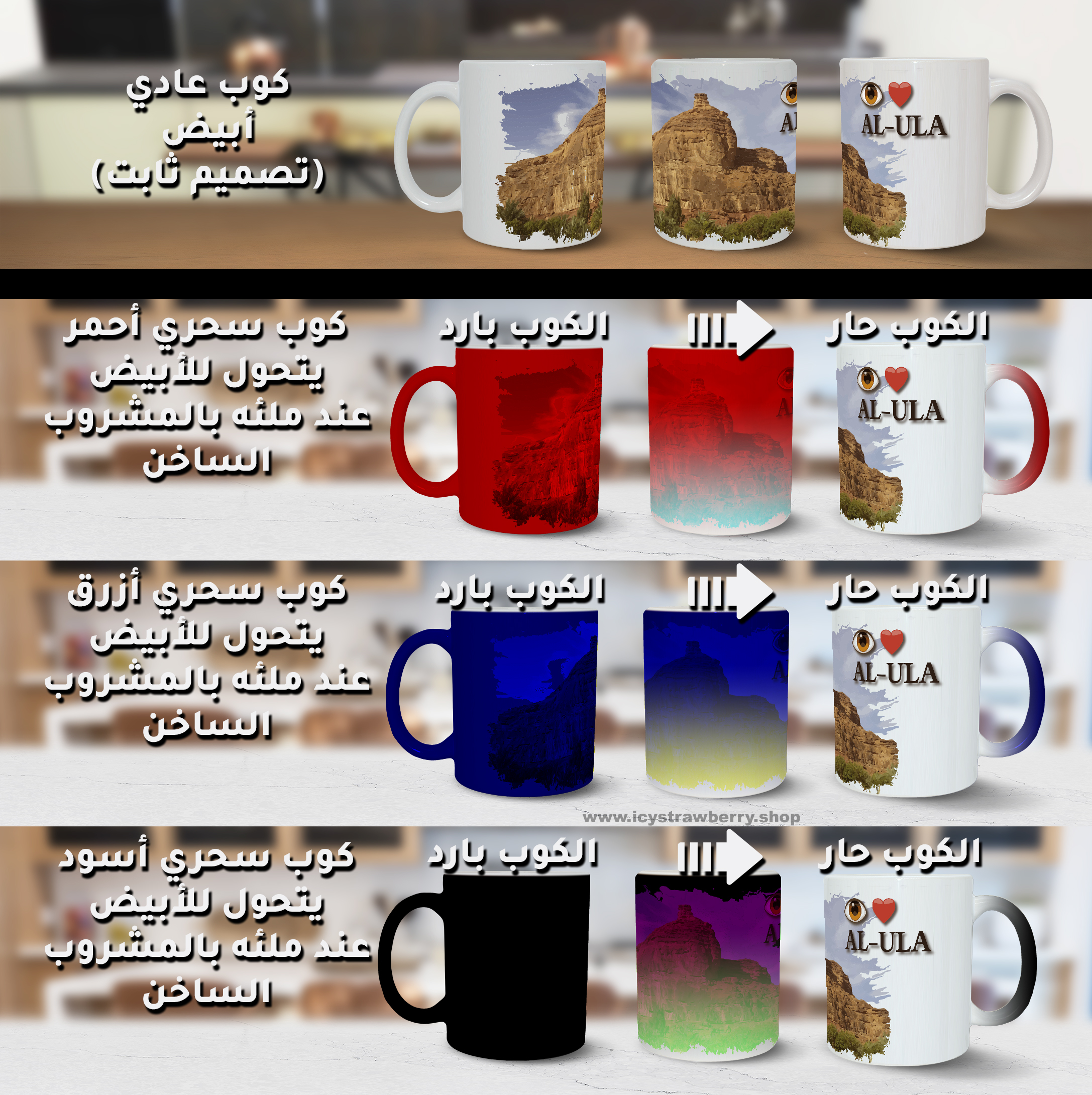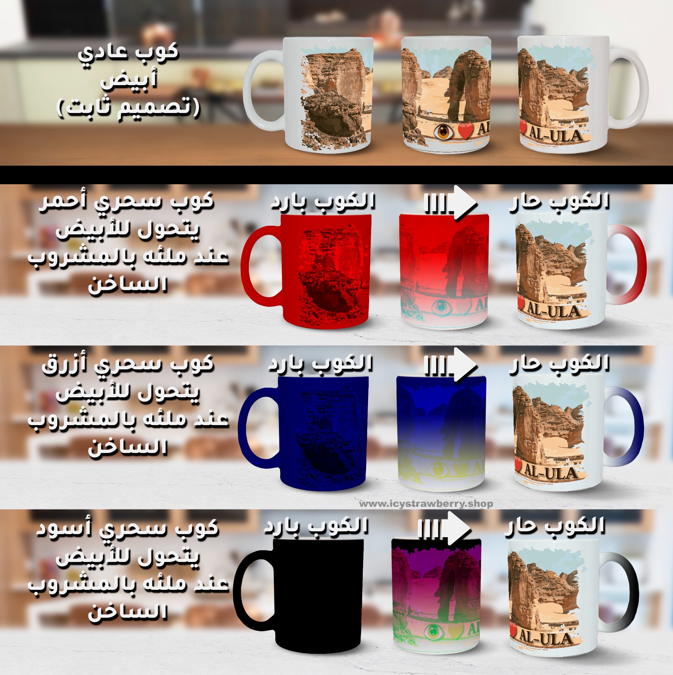 أدوات منزلية - كوب سيراميك - كوب تذكاري - رسم مقاوم للغسيل - أبيض - أحمر - أزرق - أسود - معالم المملكة - العلا - الفيل الصخري - جبال المدائن - البيوت الجبلية