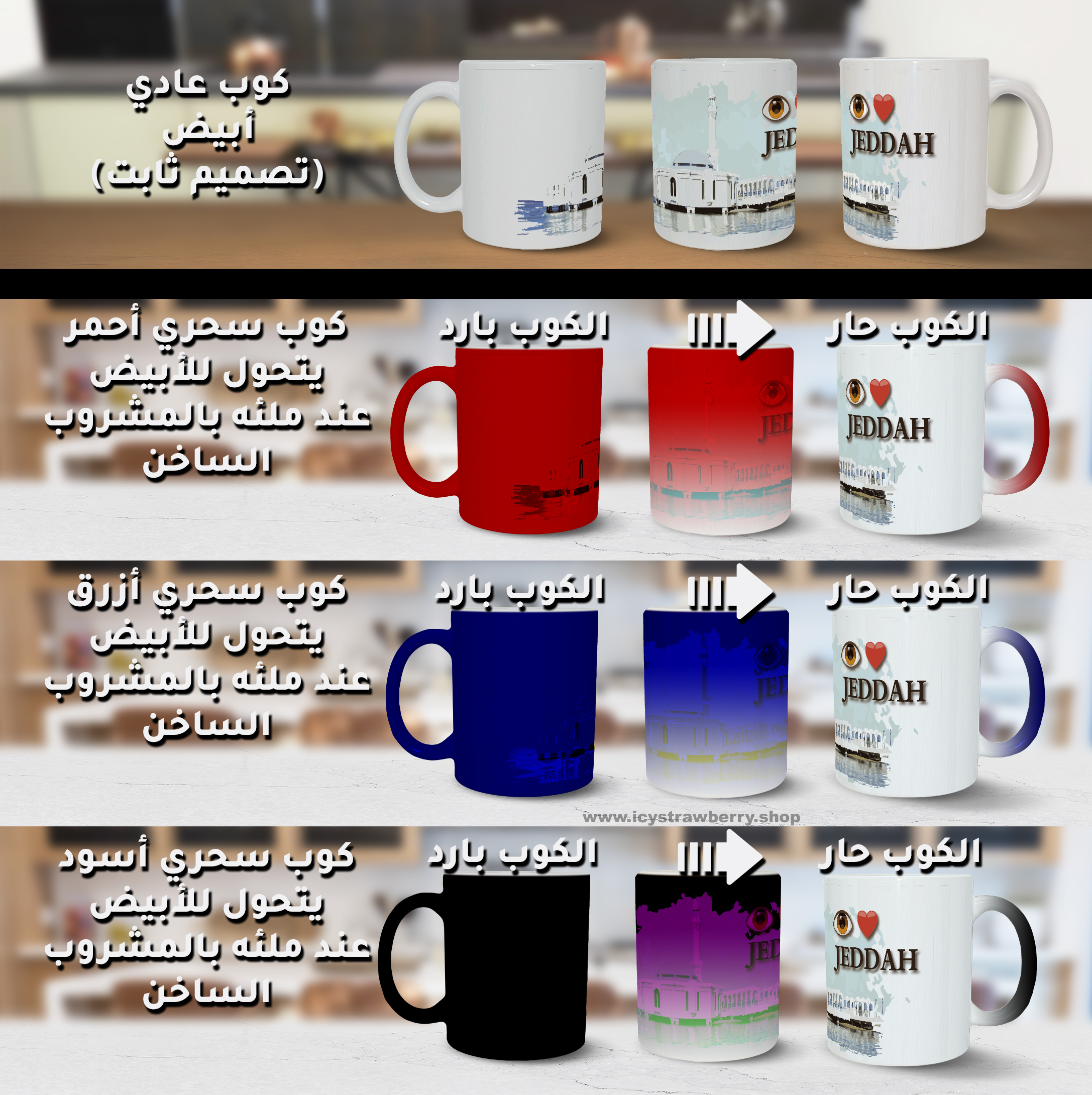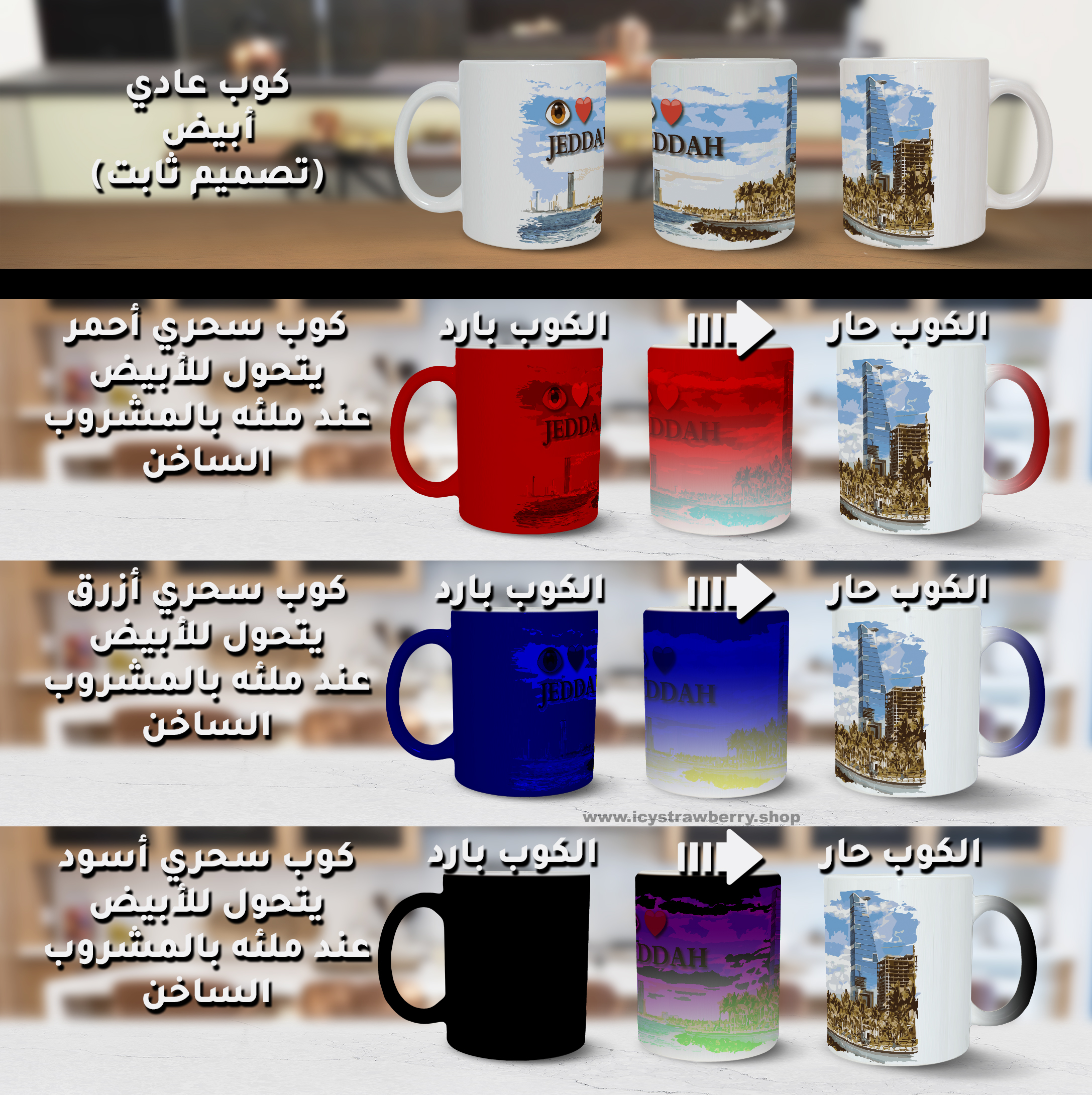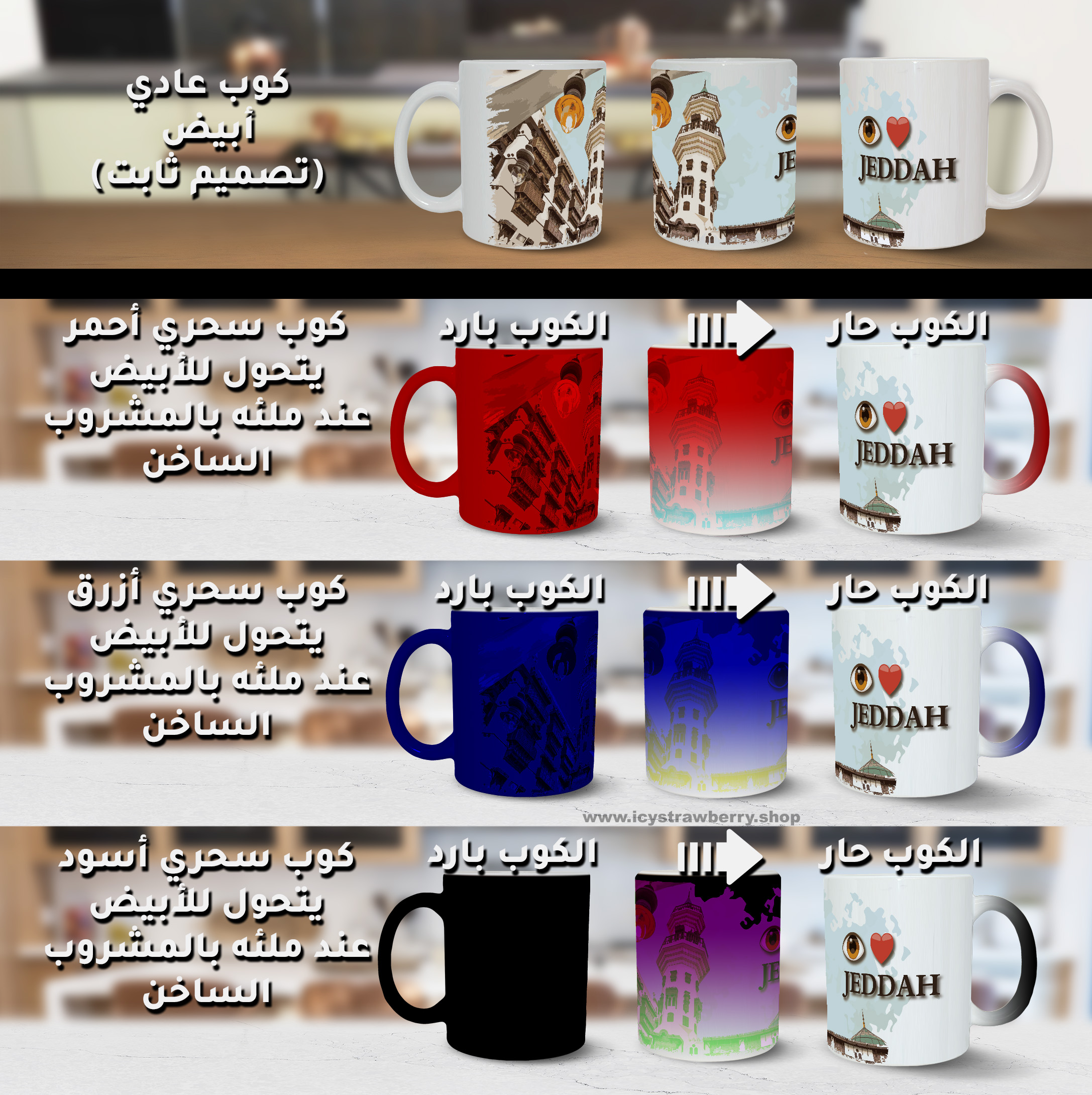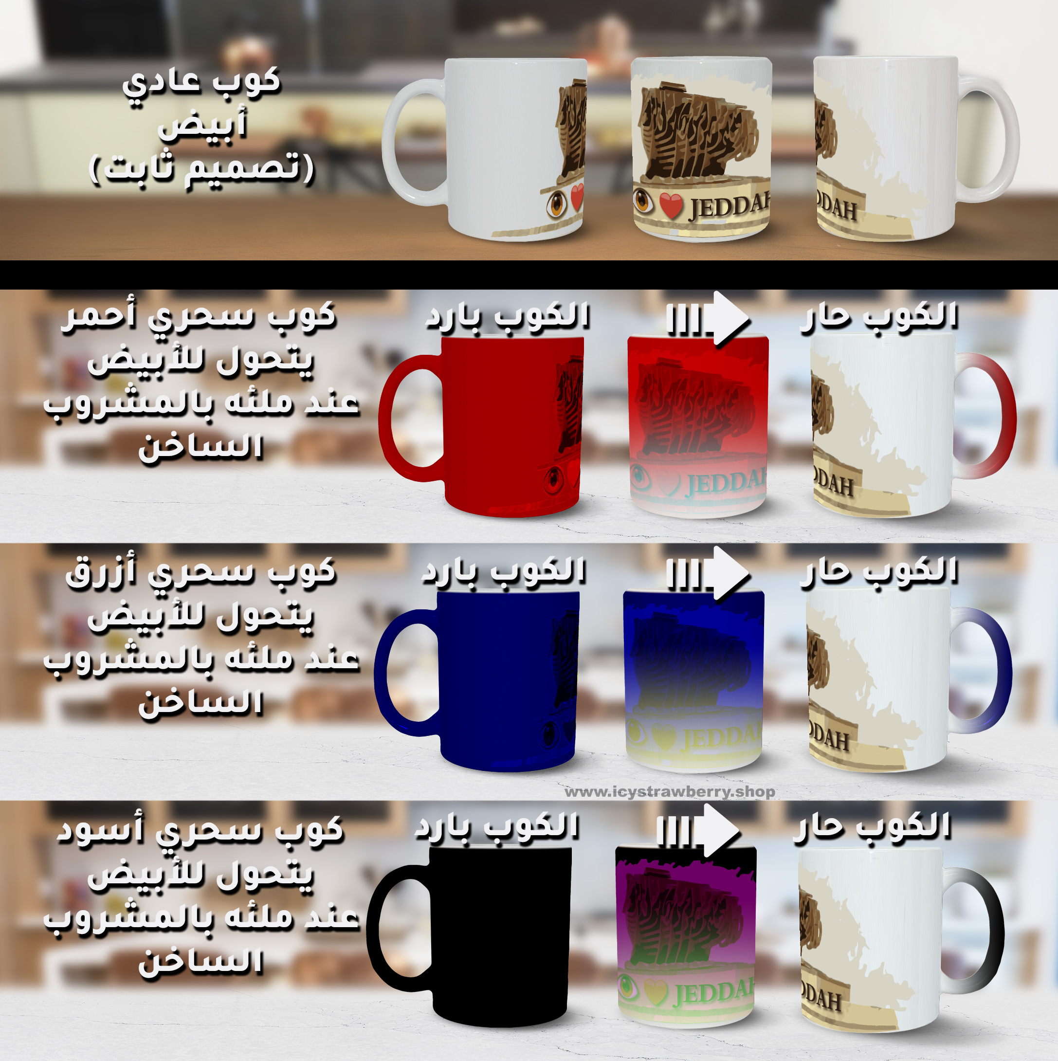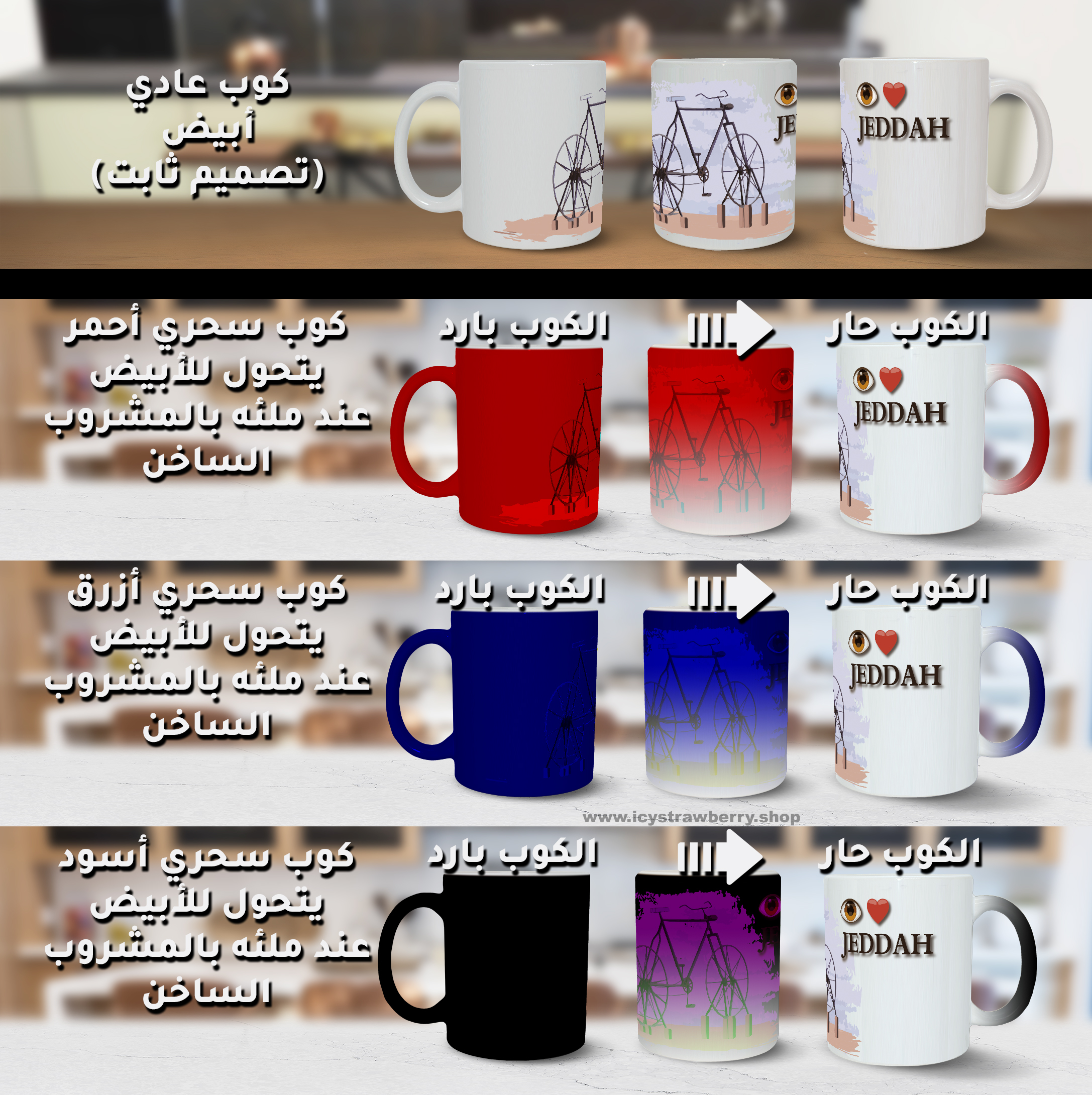 tableware - mug - souvenir - wash-resistant designs - white - red - blue - black - saudi arabia landmarks - jeddah - madinat al-taiyebat - corniche - fountain - masjid al-rahma - masjid al-wajiha - aya boat - bicycle - bab makkah