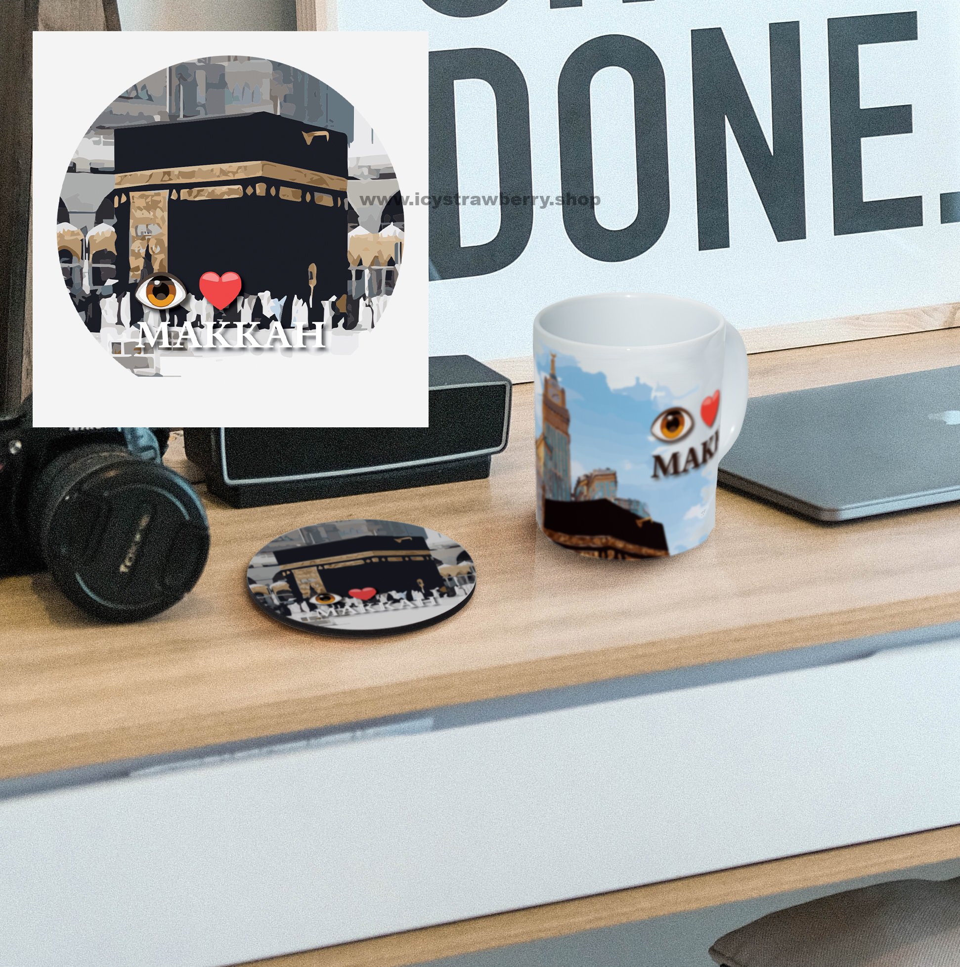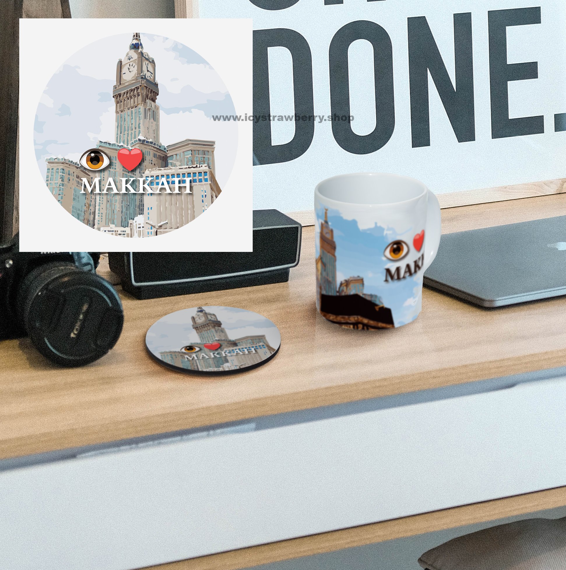 tableware - coaster - mdf - saudi arabia landmarks - makkah - kaaba - chandelier al-masjid al-haram - clock tower - historic house - jabal al-noor