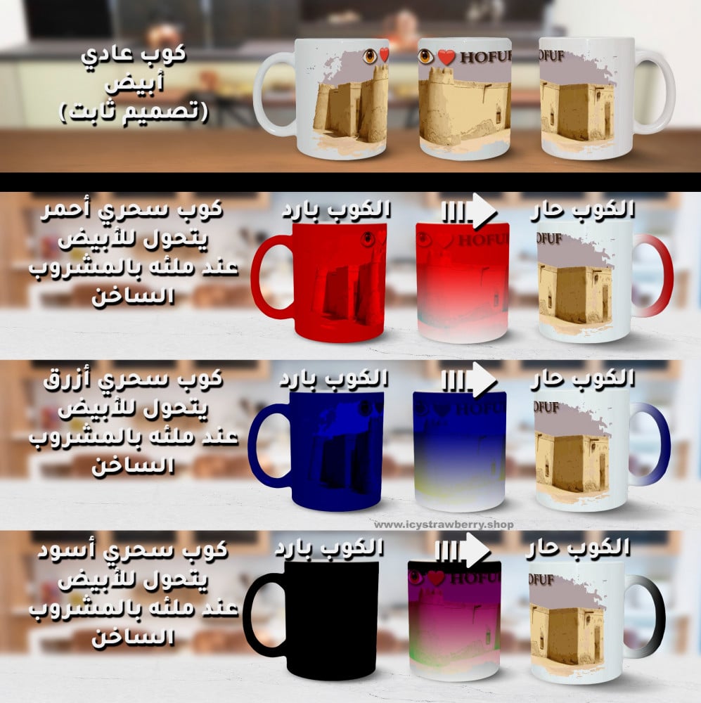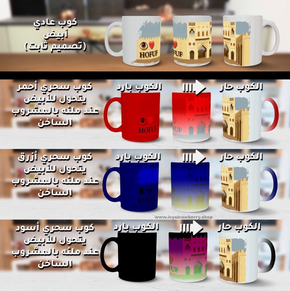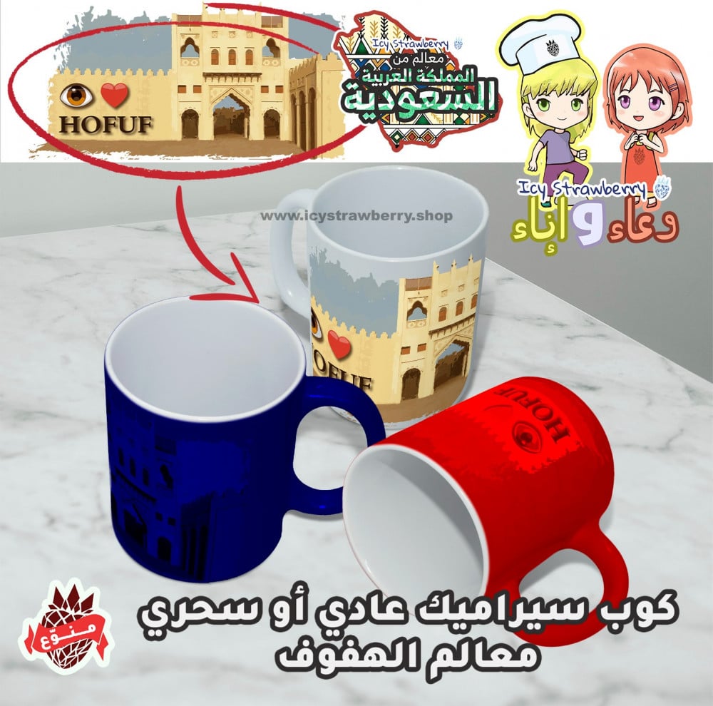 tableware - mug - souvenir - wash-resistant designs - white - red - blue - black - saudi arabia landmarks - hofuf - qaisariah - jawatha