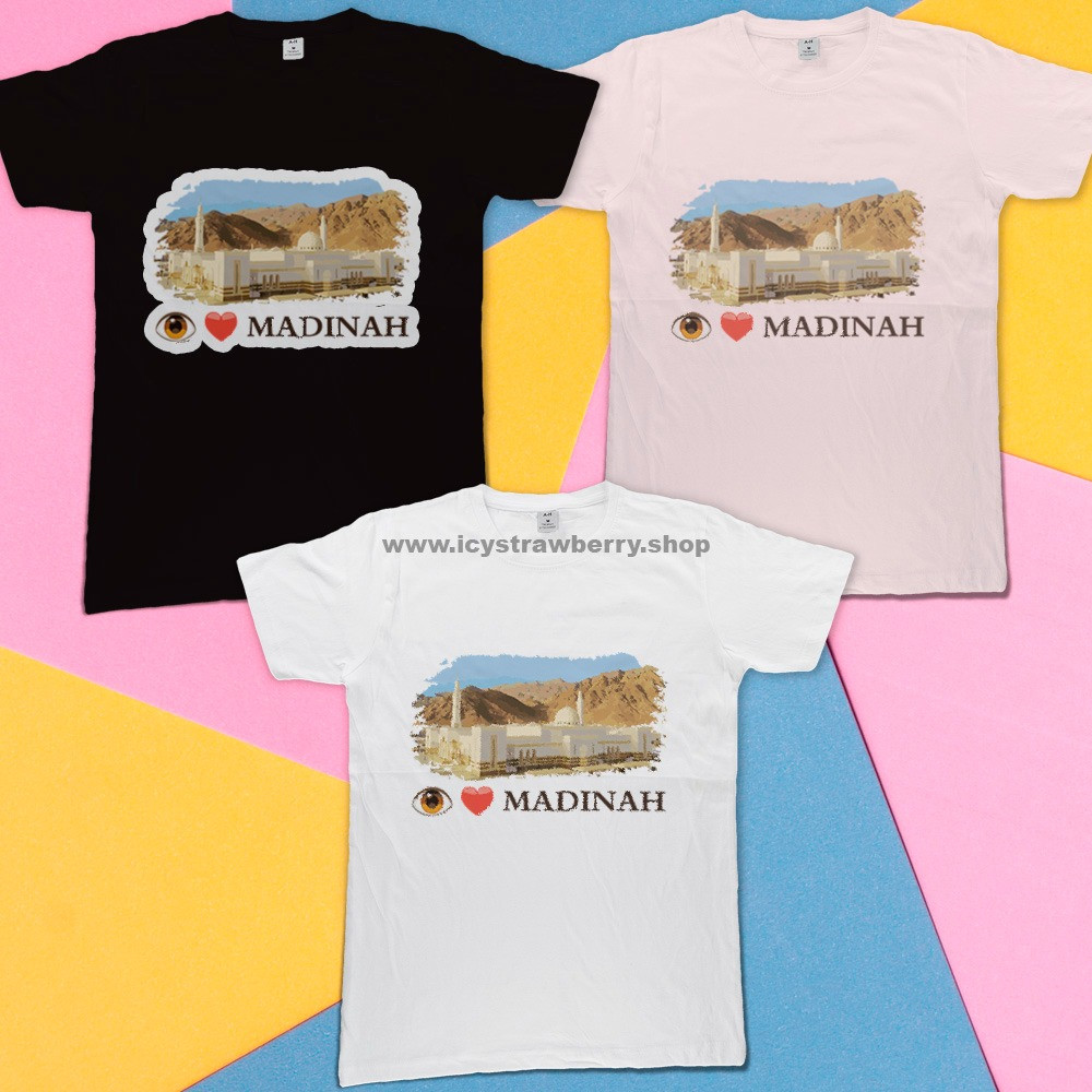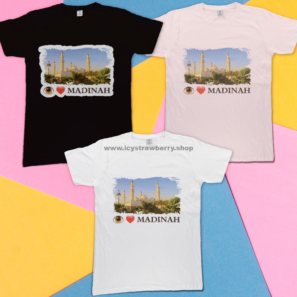 garments - shirt - t-shirt - cotton - unisex - white - pink - black - souvenir - saudi arabia landmarks - madinah - al-masjid al-nabawi - masjid qubaa - jabal uhud